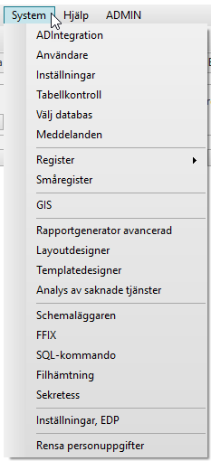 Under menyn System finns de funktioner som styr hur EDP Future skall se ut och fungera. Parameterinställningar, användarregister, databasinställningar och behörigheter är några av de centrala funktioner som administreras här.