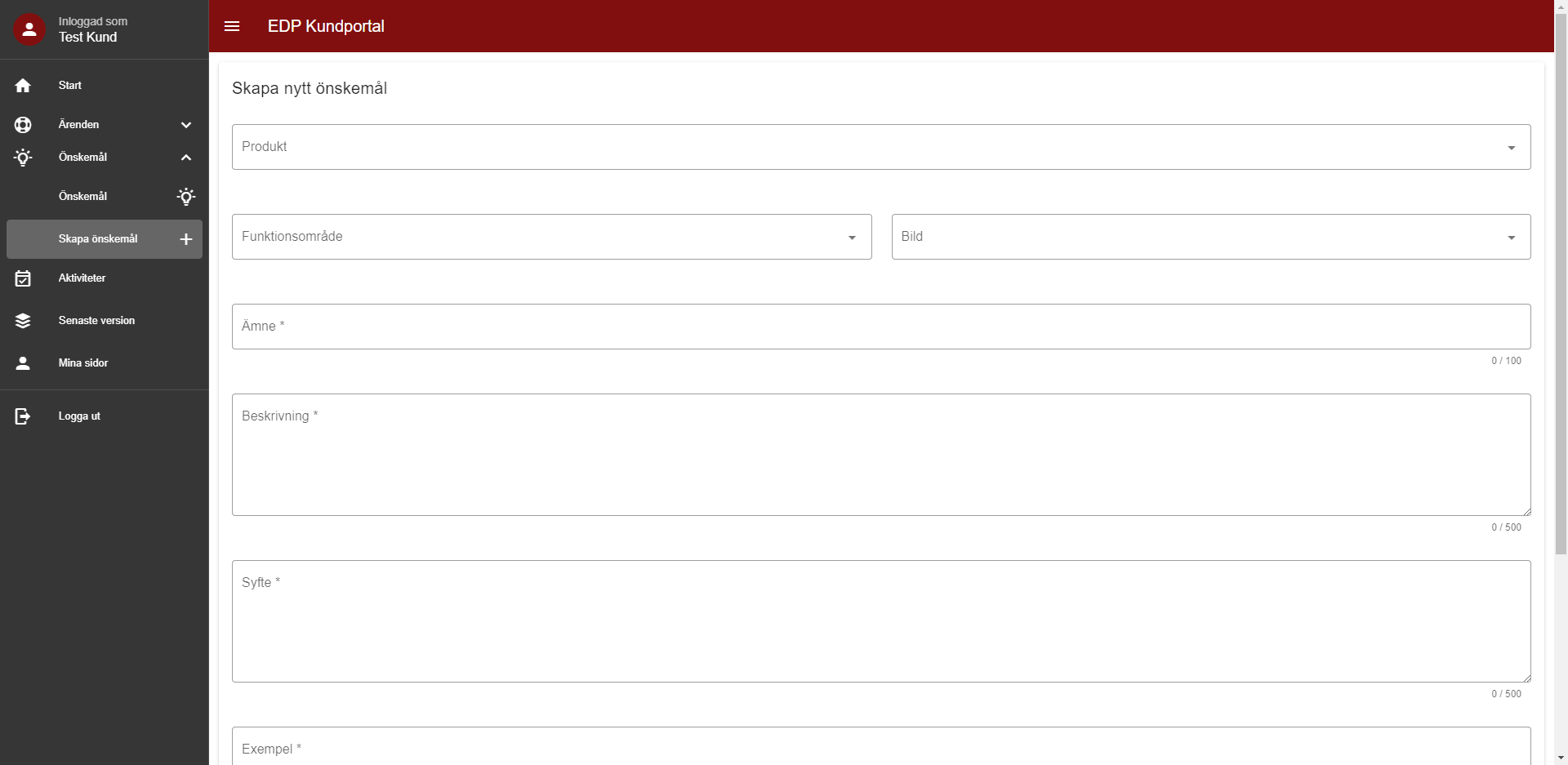 1. Klicka på menyvalet Skapa önskemål. Fyll i fälten med relevant information. Beskriv utförligt vad ni vill kunna göra i systemet och varför (vad vill ni uppnå, hur hade det underlättat för er).