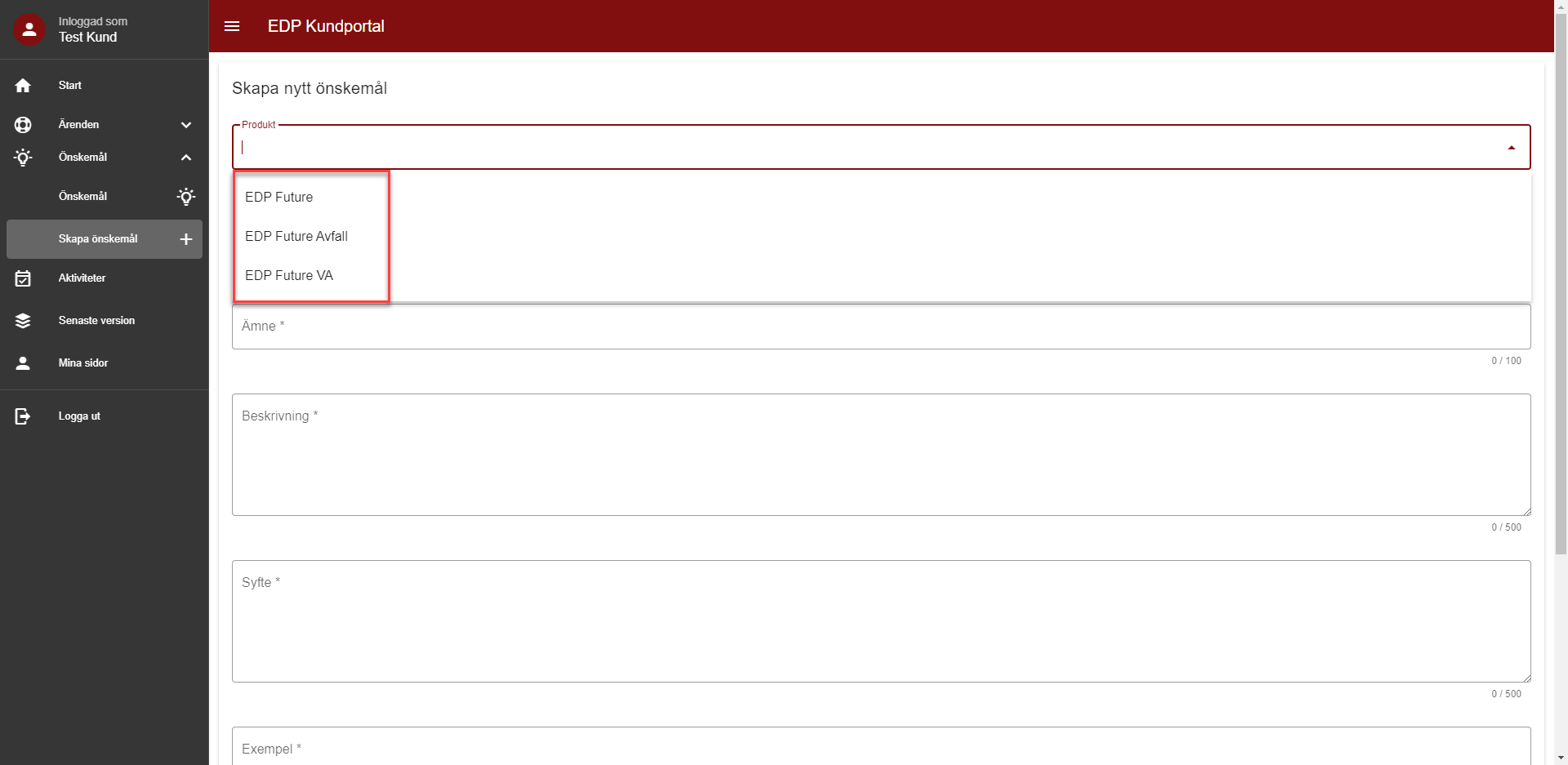 Under menyvalet Önskemål kan du som portalanvändare och portaladministratör skapa nya önskemål och se vilka önskemål som du har skapat och följa dess status.