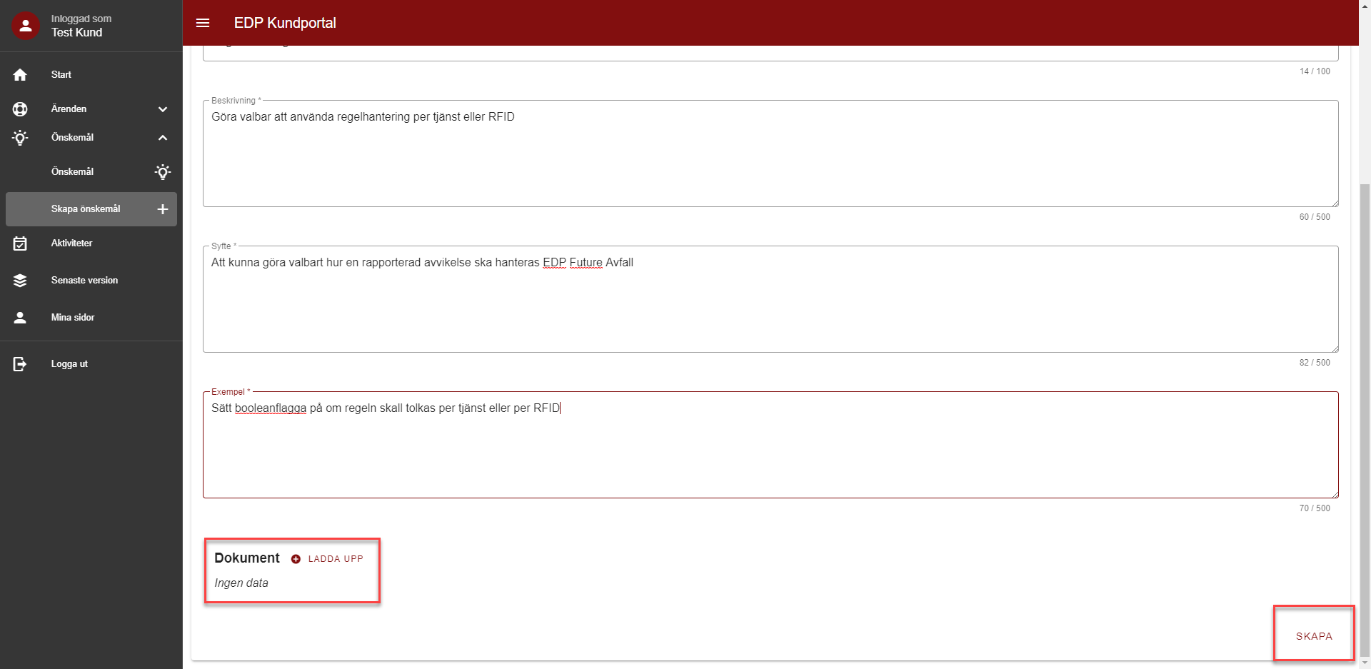 4. Har du något dokument, exempelvis en skärmdump, kan du ladda upp det genom att att välja till Dokument längst ner på sidan och klicka på Ladda upp. När du har fyllt i relevanta fält, klicka på knappen Skapa.