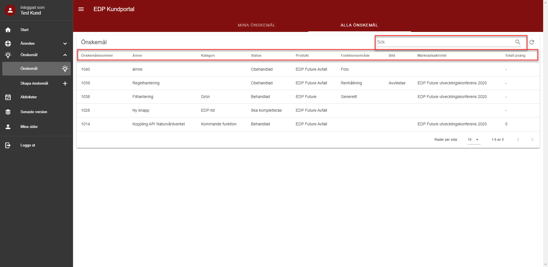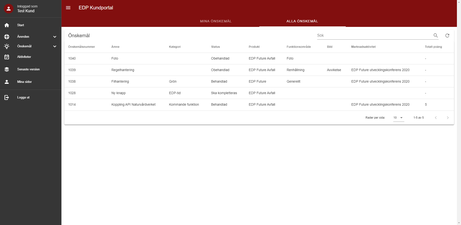 5. Du kan följa önskemålets status och information i Kundportalen. Som portalanvändare ser du dina egna skapade önskemål och dess status. Som portaladministratör ser du alla kunders inskickade önskemål. Klicka på raden om du vill se mer information om önskemålet.