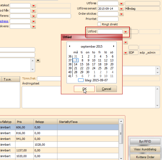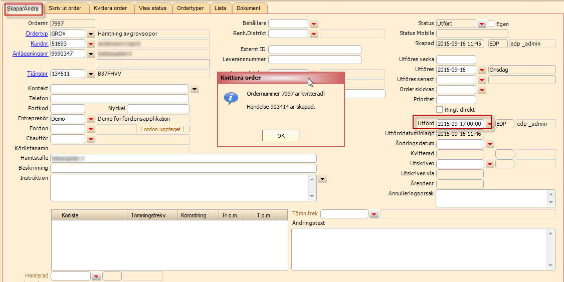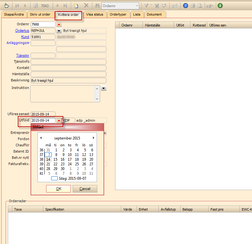 Kvittera order - Välj datum för fältet: Utförd. Tryck Spara. En fråga kommer om man vill skriva ut ordern.