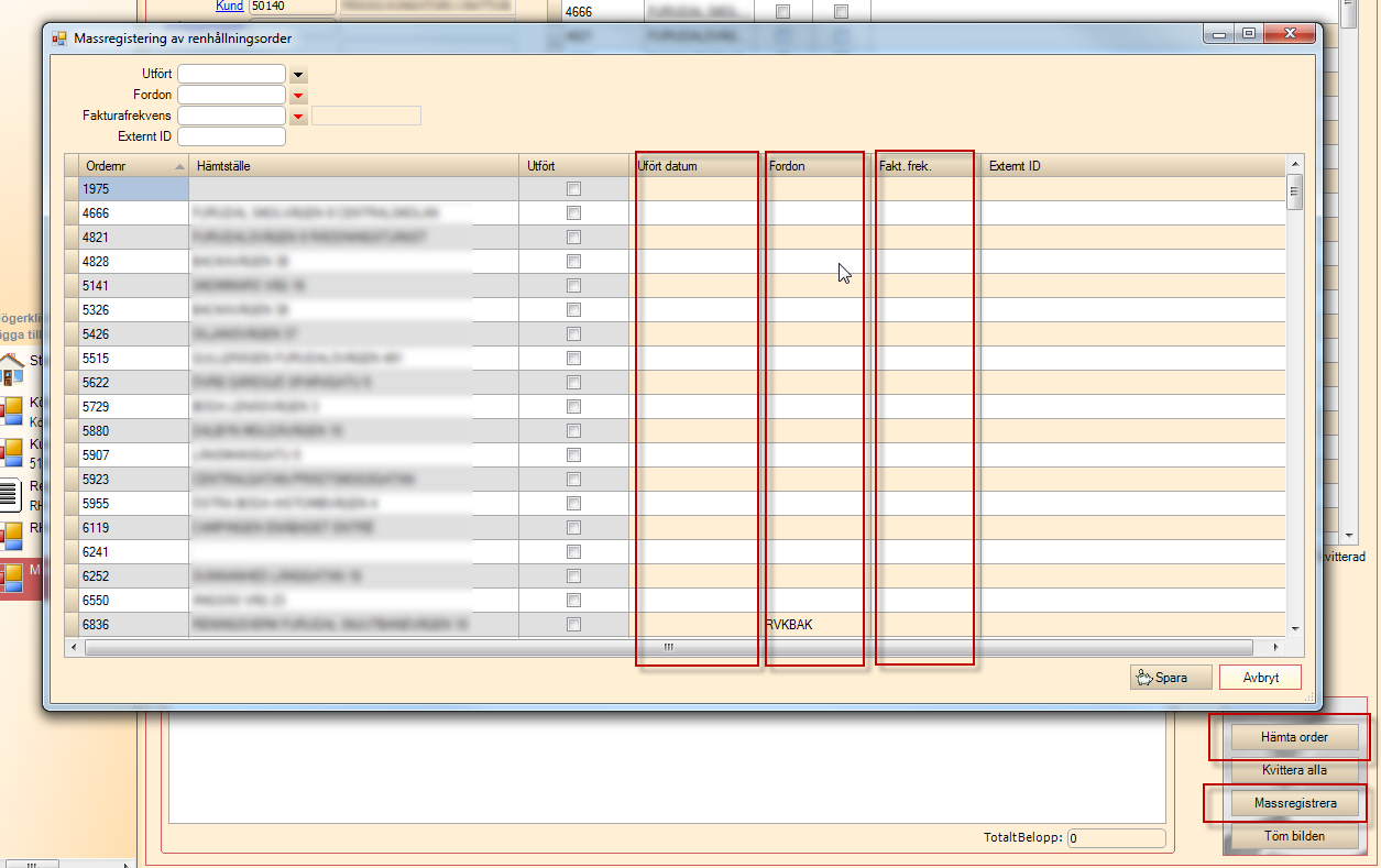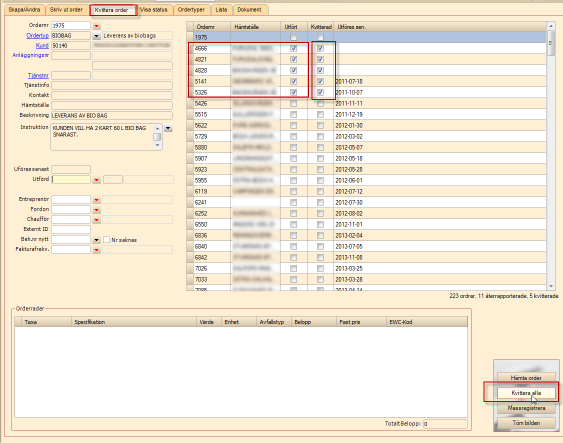 Massregistrering görs i fliken Kvittera orderr. Tryck på Hämta order, då hämtas de ordrar som ej blivit registrerade. Tryck sedan Massregistrera så öppnas fönstret Massregistrering av renhållningsordrar.