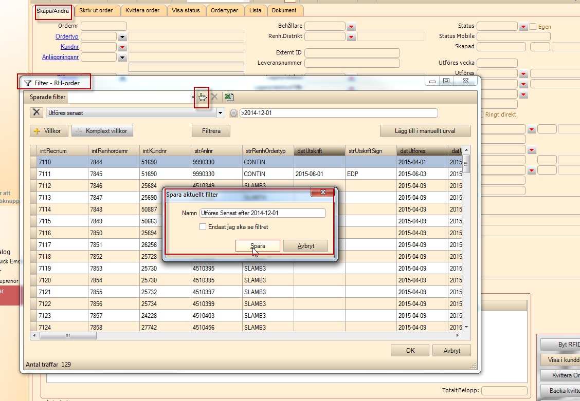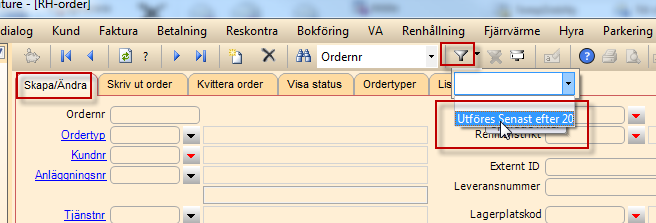 Vill man underlätta sitt arbete kan filter skapas på de ordrar som sen ska utföras och kvitteras. Det görs under fliken Skapa/Ändra.