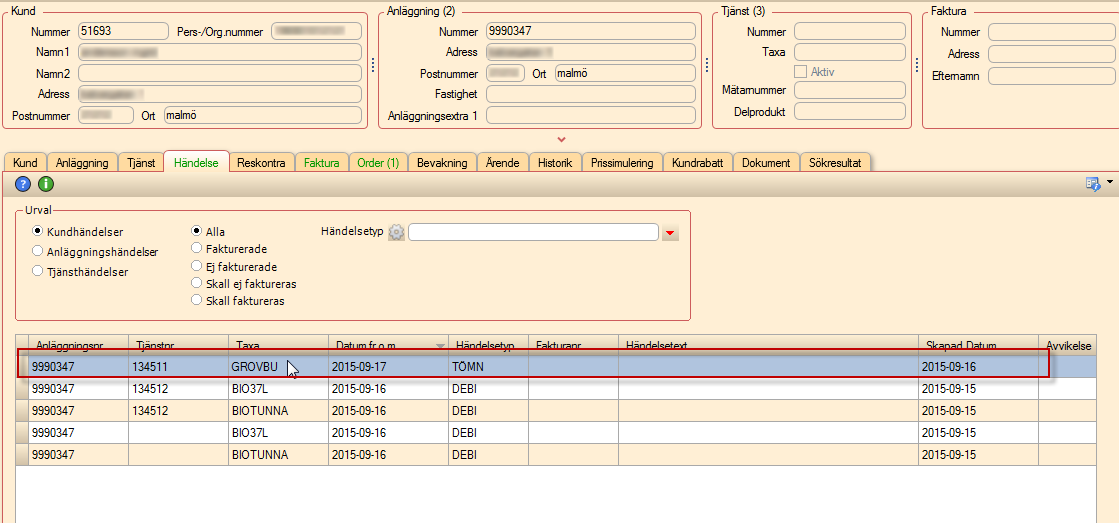 Vid kvittering skapas händelser på tjänsten i Kunddialogen, under förutsättning att Utfört datumfält är ifyllt: