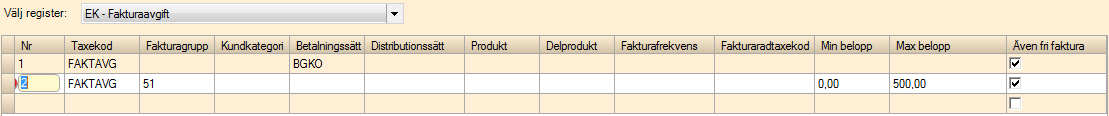I System>Småregister; EK - Fakturaavgift lägger man in vilken faktureringsavgiftstaxa som uppfyller valda kriterier. T.ex. taxa FAKTAVG faktureras ut på alla fakturor med betalningssätt BGKO, även fria fakturor.