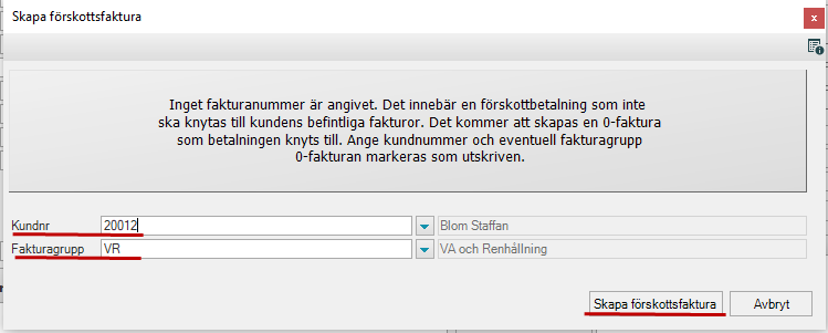 Nu skapas en förskottsfaktura på 0 kr med betalstatus HELB (Helbetald). Fakturadatum, förfallodatum och utskriftsdatum sätts till dagens datum.