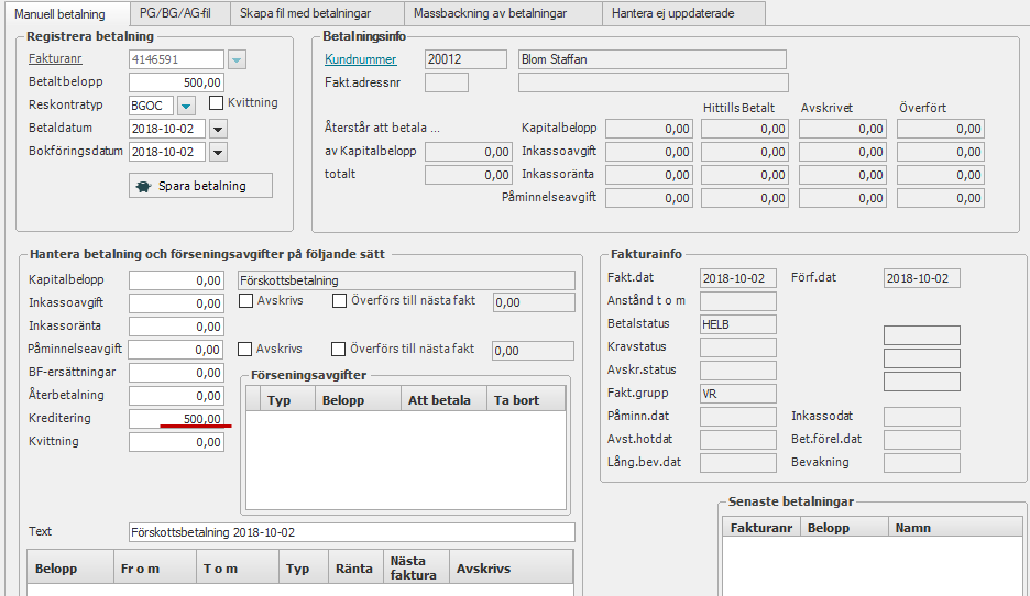 Betalningen registreras som en överbetalning och det skapas ett tillgodhavande på kunden. Kreditering föreslås automatiskt.
