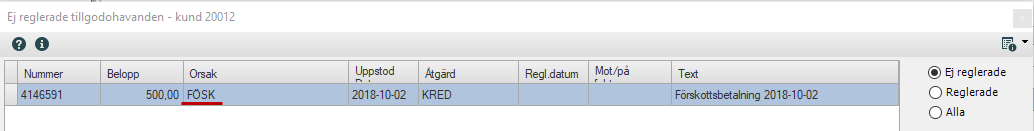 Du ser tillgodoposten i reskontrabilden under knappen Visa tillgodo. Tillgodoposten uppdateras med Orsak FÖSK
