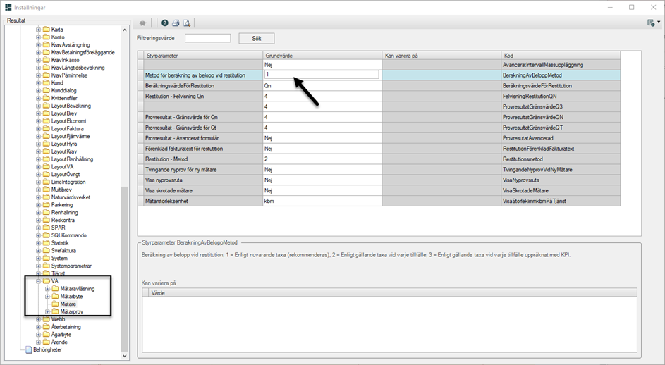 Under inställningar VA > Mätare > Restitution > Metod för beräkning av belopp vid restitution kan ni ställa in vilken beräkning av belopp som ni vill ska vara förvald när ni öppnar fliken Restitution.