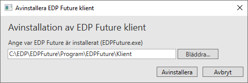 Dubbelklicka på filen UninstallClient.exe för att starta avinstallationen av EDP Future klient 1. Filen hittas i katalogen EDPFutureUpdate>Klient. Ange sökvägen till EDP Futures klientkatalog och klicka Avinstallera.