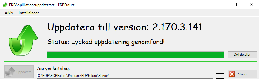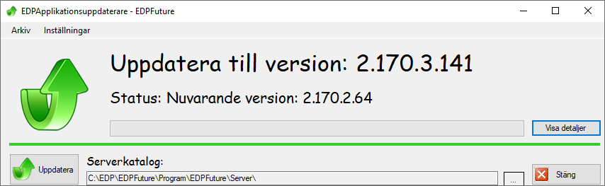 Obs! Om sökvägen till EDP Futures serverkatalog saknas i kolumnen Serverkatlog i EDPApplikationsuppdaterare - EDP Future kommer inte uppdateringen kunna köras och då behöver serverkatalogen först väljas via knappen