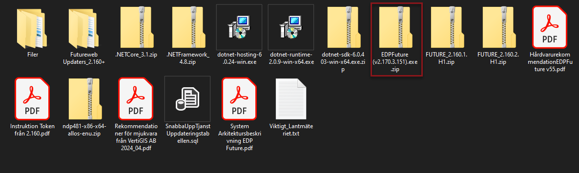 Börja med att läsa igenom Uppdateringsanvisningar för den version av EDP Future ni ska uppdatera till. Här anges vad som krävs för att kunna uppdatera.