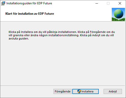 Nu är EDP Future klienten redo att uppdateras, klicka Installera för att starta uppdateringen av klienten eller Förgående för att gå tillbaka och säkerställa att alla uppgifter är angivna korrekt.