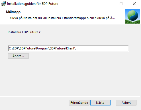 Ange Målmapp där klienten ska installeras (sökvägen till EDP Futures klient) och klicka Nästa.