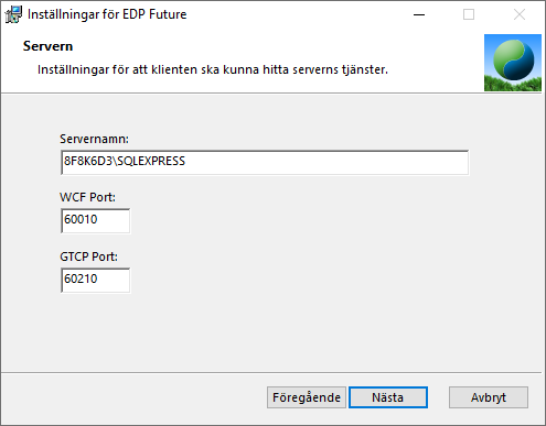 Alternativ 1: Distribuera klient-msi:n till användarna genom att först avinstallera den gamla klienten och därefter installera den nya klient-msi:n. Vid installation ska port och servernamn anges. Skapa ny genväg till EDPFuture.exe.