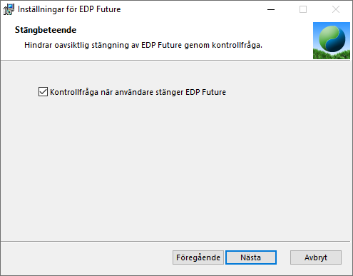 Markera rutan Kontrollfråga när användare stänger EDP Future om ni vill att ett fönster med en kontrollfråga ska öppnas när EDP Future stängs ner av användare (kan anges så att man inte råkar stänga ner EDP Future av misstag) och klicka Nästa.