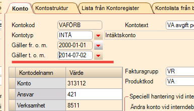 Sök upp taxekoden i Faktura>Taxor och priser för inkassoavgiften och kontrollera vilken kontokod som är knuten till taxan. Gå sedan till Bokföring>Konto och sök upp kontokoden och kontrollera värdena på de olika kontodelarna.