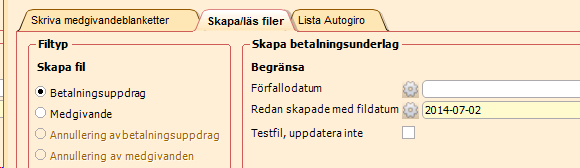 Gå till Betalning>Autogiro; Fliken Skapa/läs filer och välj ”Betalningsuppdrag” som filtyp samt ange det datum som tidigare betalningsuppdragsfil skapades i fältet ”Redan skapade med fildatum”. Därefter klicka på knappen ”Skapa fil”.