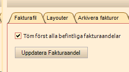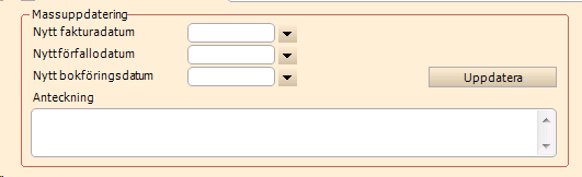 Det går att massuppdatera vissa uppgifter i Faktura>Fakturalista. Gör först urval på vilka fakturor det gäller genom att ange fakturanummerserien i ”Fakturanr” eller gör urval på ”Förfallodatum”. Ange därefter nytt förfallodatum i rutan Massuppdatering. Klicka på Uppdatera.