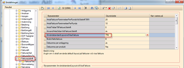 Det går att ställa in att antingen visa standardlayouten eller den egna fakturalayouten. Detta görs i System>Inställningar>Fakturautskrift>AnvändstandardLayoutvidVisaFaktura.