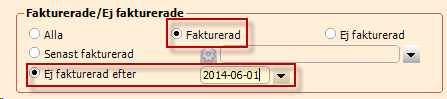 Kund>Lista/Brev, fliken Urval Tjänst, rutan Fakturerade/Ej fakturerade. Markera ”Fakturerad” och ”Ej fakturerad efter”, ange datum. Förhandsgranska.