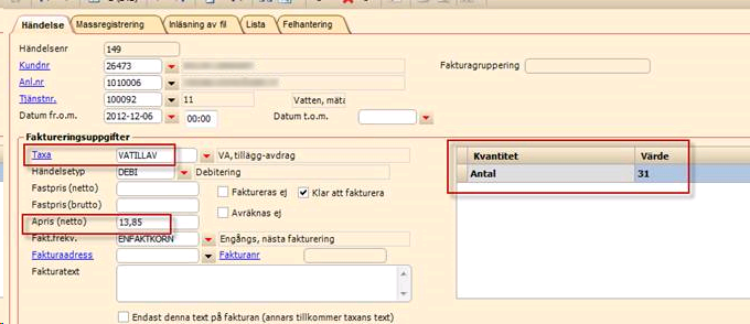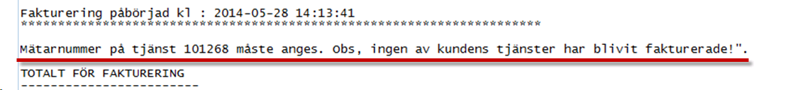 Får man nedanstående meddelande på sin fakturakvittens, och mätare finns uppsatt på tjänsten, kan det bero på att tjänsten har haft en period utan förbrukning. En taxa utan FÖRB måste då läggas in under denna period.