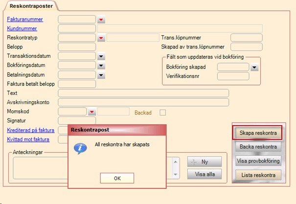 När dialogrutan ”All reskontra har skapats” kommer upp, så kontrollera om posterna är betalda i reskontran.