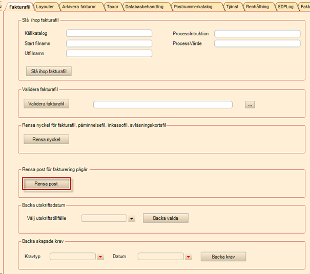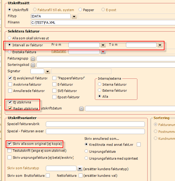 Vill man skapa sin fakturafil på nytt, är det viktigt att tänka på att fylla i enligt nedan. Fakturaintervallet hittar man på kvittensen som skapades vid Skapa faktura.