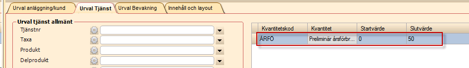 Kund>Lista/Brev, fliken Urval Tjänst. Högerklicka i kvantitetsgriden och lägg till kvantitetskod ÅRFÖ. Ange startvärde och slutvärde. Förhandsgranska