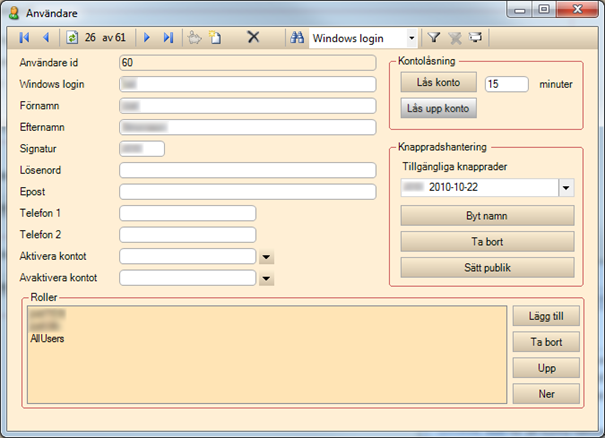 Här lägger man upp användare i Future. Man kan tidsbestämma användarens konto, eller tillfälligt stänga av. Man kan lägga in nya lösenord och koppla roller.