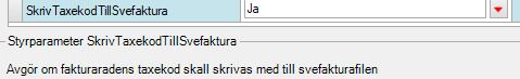 På styrparametern SkrivTaxekodTillSvefaktura via menyn System. Välj Inställningar > EDPParameters > Parameters och underkatalogen Svefaktura kan man ange värde JA om taxekoden ska skrivas ut i fältet för artikelkod i svefakturan.