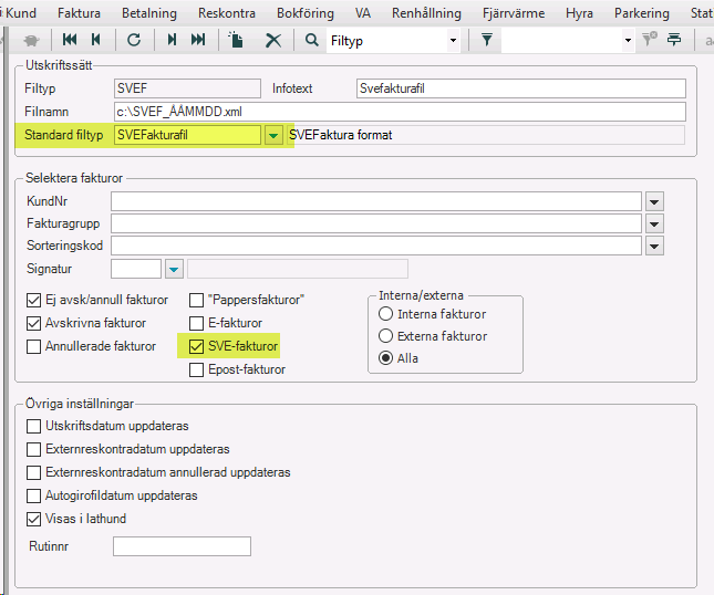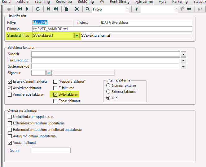 Gå till menyn Faktura > Filskrivningsinställningar, sök upp filtypen för er vanliga fakturafil. Markera kryssrutan SVE-fakturor, spara. Anledningen till att SVE-fakturor ska markeras är att om Svefakturan inte går igenom validering kommer IDATA att skicka pappersfaktura istället.