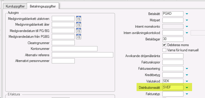 För varje kund som önskar svefaktura behövs distributionssättet ändras till SVEF (Svefaktura) via bilden Kund. Välj underfliken Betalningsuppgifter och ändra uppgiften i fältet Distributionssätt.