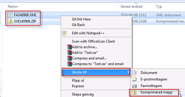 Det skapas nu en zipfil som innehåller alla ingående Svefakturafiler. - Nu ska det göras en zipfil av fakturafilen och SVE-zippen, man kan säga att det blir en ”zip-i-zip”. Markera de båda filerna, högerklicka, välj Skicka till Komprimerad mapp.