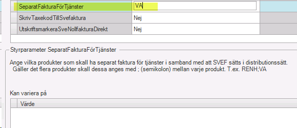 På styrparametern SeparatFakturaFörTjänster via menyn System. Välj Inställningar > EDPParameters > Parameters och underkatalogen Svefaktura kan man ange för vilka produkter vars tjänster ska faktureras separat. Ange VA för va-tjänster. Om flera produkter ska anges använd semikolon för att separera dem åt t.ex. VA;RENH.