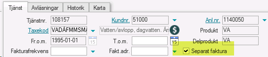 2. För befintliga VA-tjänster som har ”Separat faktura” får dessa ändras manuellt genom att ta bort dessa för varje kund med svefaktura. Det går också att beställa skript som tar bort separat faktura på tjänst i de fall man inte vill göra det manuellt.