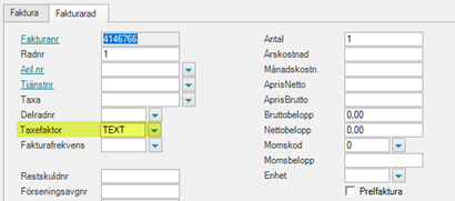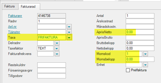 - Bläddra fram till varje fakturarad med Taxefaktor TEXT. Lägg till taxa FRIFAKTURA, AprisNetto 0 kr, Momsbelopp 0 kr och spara ändringarna.